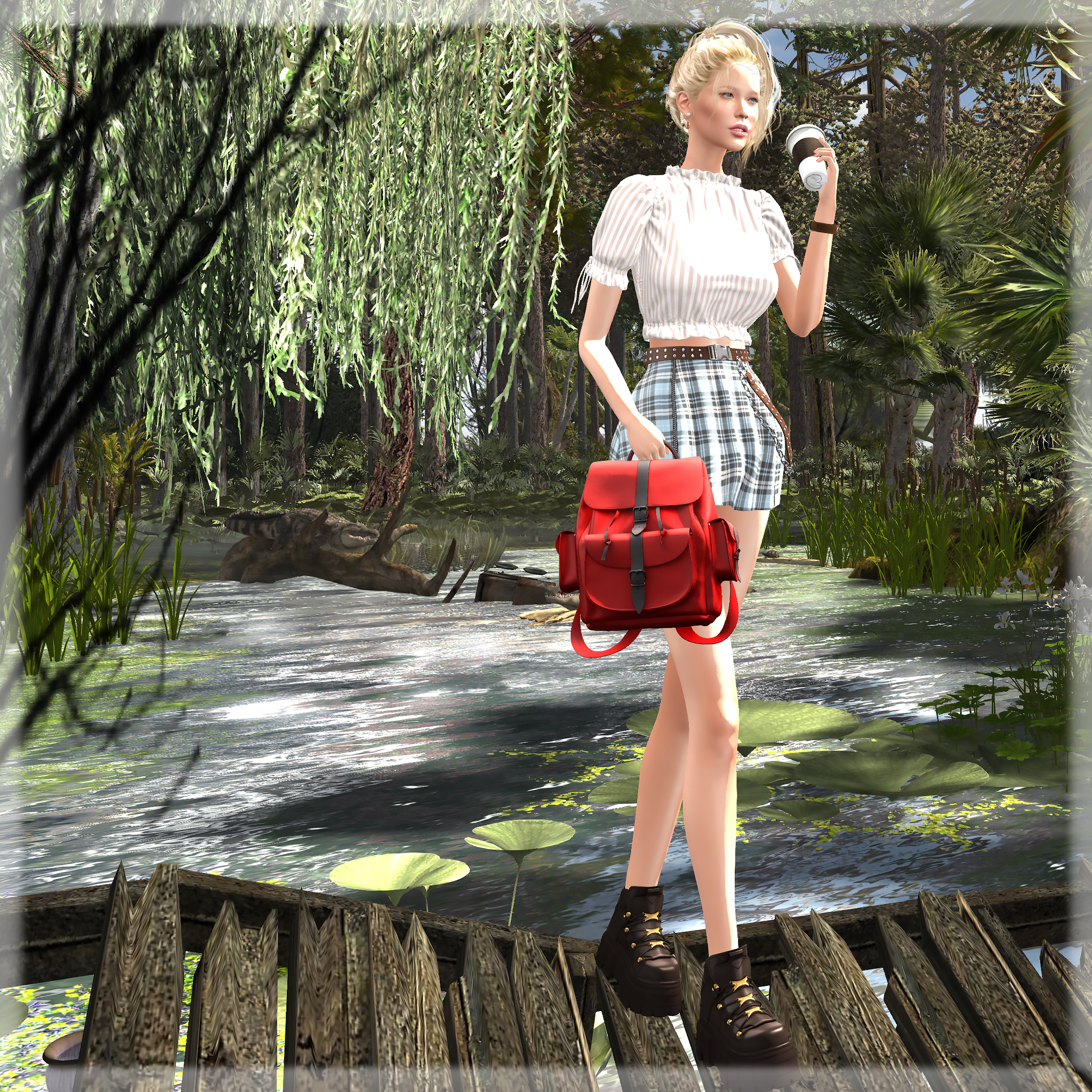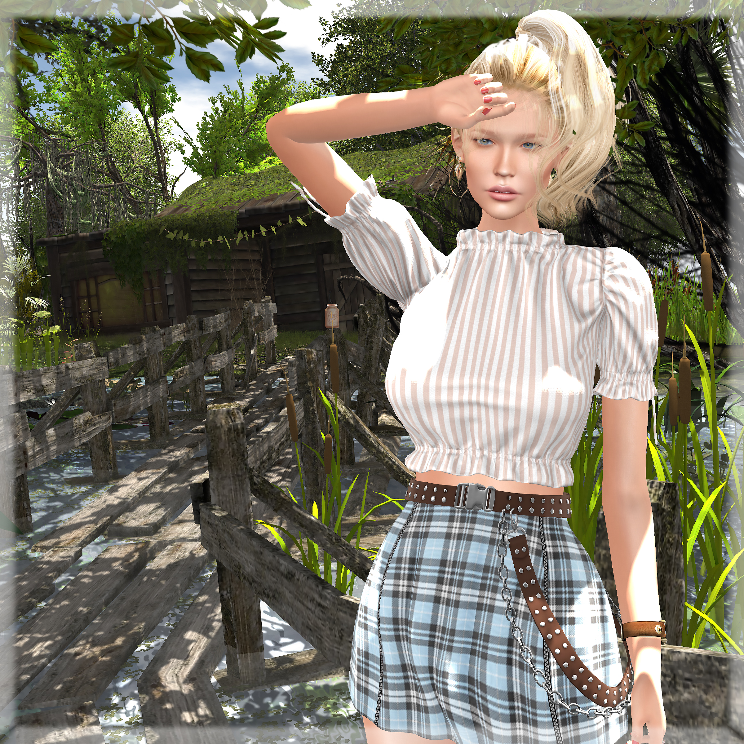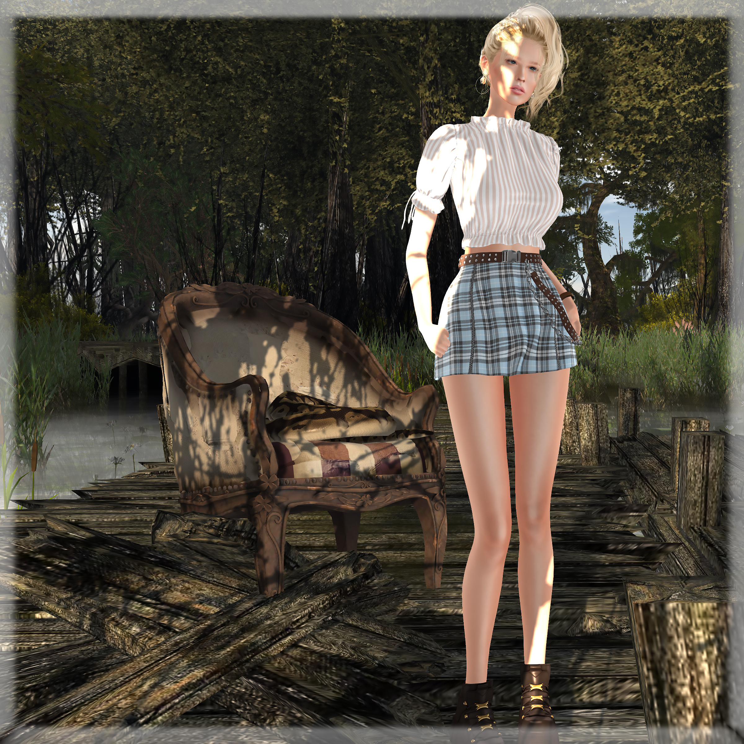 10/15/2020 remains… style card Hair: tram – J1007 hair(hud b) @ Kustom9 (bangs K9 gift at tram vendor) Eyes: AG. – Fame Eyes (glass) @ Kustom9 Top: fleur. – kenna top (pattern 4) @ Kustom9 Skirt: Luas – Tiffany Skirt (sky) @ Kustom9 Boots: [Enchante’] – Maeve Boots (brown) @ Kustom9 Pose: Ana Pose Location: Wooley Swamp
