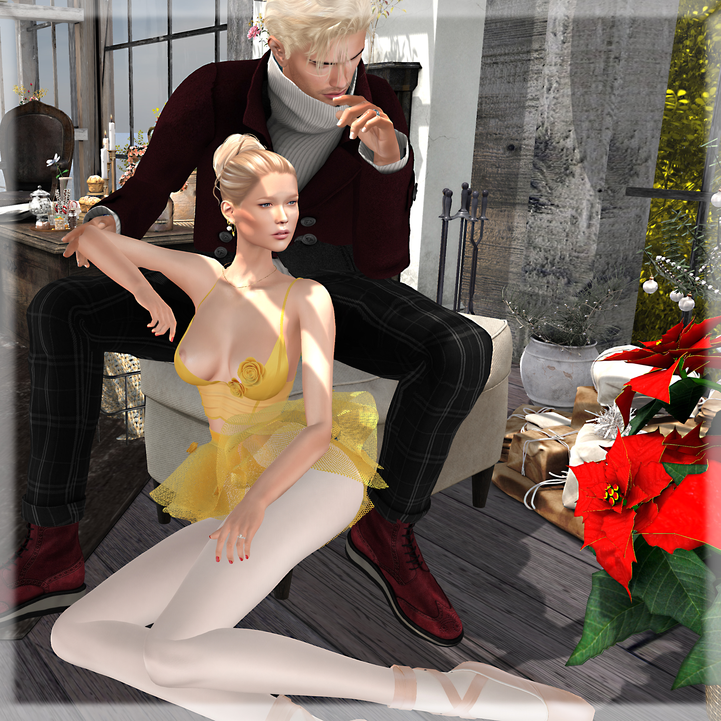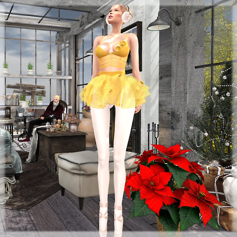 12/18/2020 still trying… style card Hair: Tableau Vivant – Cozy bun add-on (blonds) Eyes: AG. –Soulful Eyes (pearl) Outfit: MILOTA – Sneganna common (#4, #9) @ Epiphany Ballet Shoes: MI960840X – Ballerina Tip Toe Shoes Ear Muff: Amitie – Winter (gacha 06) @ Epiphany Pose & Couple pose: Ana Pose